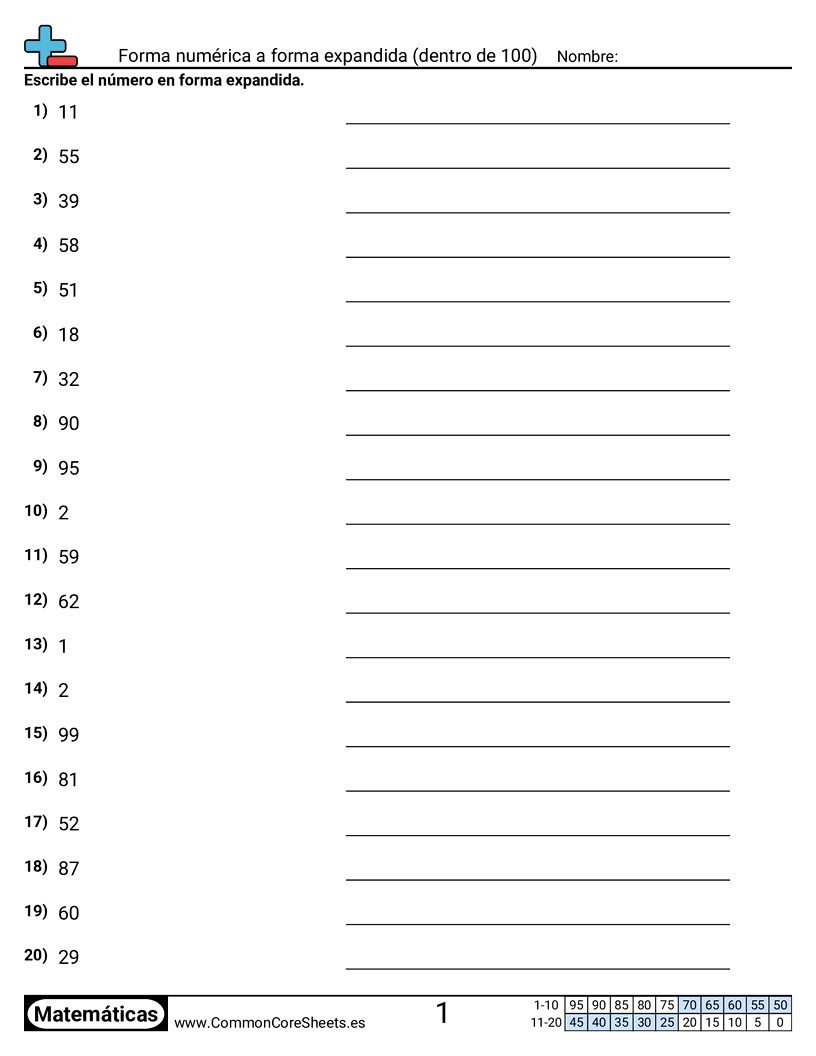 Cada hoja de trabajo tiene 20 problemas para convertir de forma numérica a forma expandida.