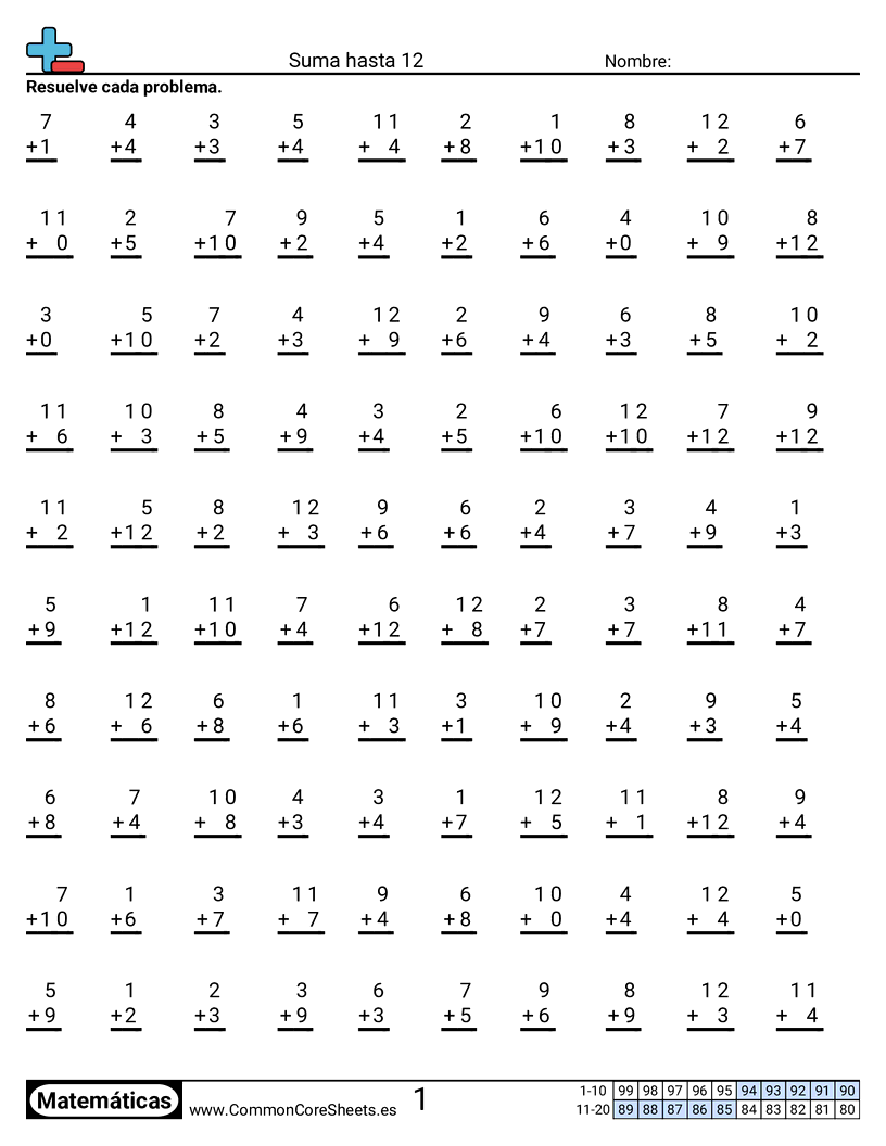 Hojas de trabajo gratis de math sobre Suma hasta VAR. Cada hoja tiene 100 ejercicios con hoja de respuestas y es ideal para maestros y educación en casa. Puedes descargar el PDF, crear tarjetas de memoria o configurarlo para aprendizaje en línea.