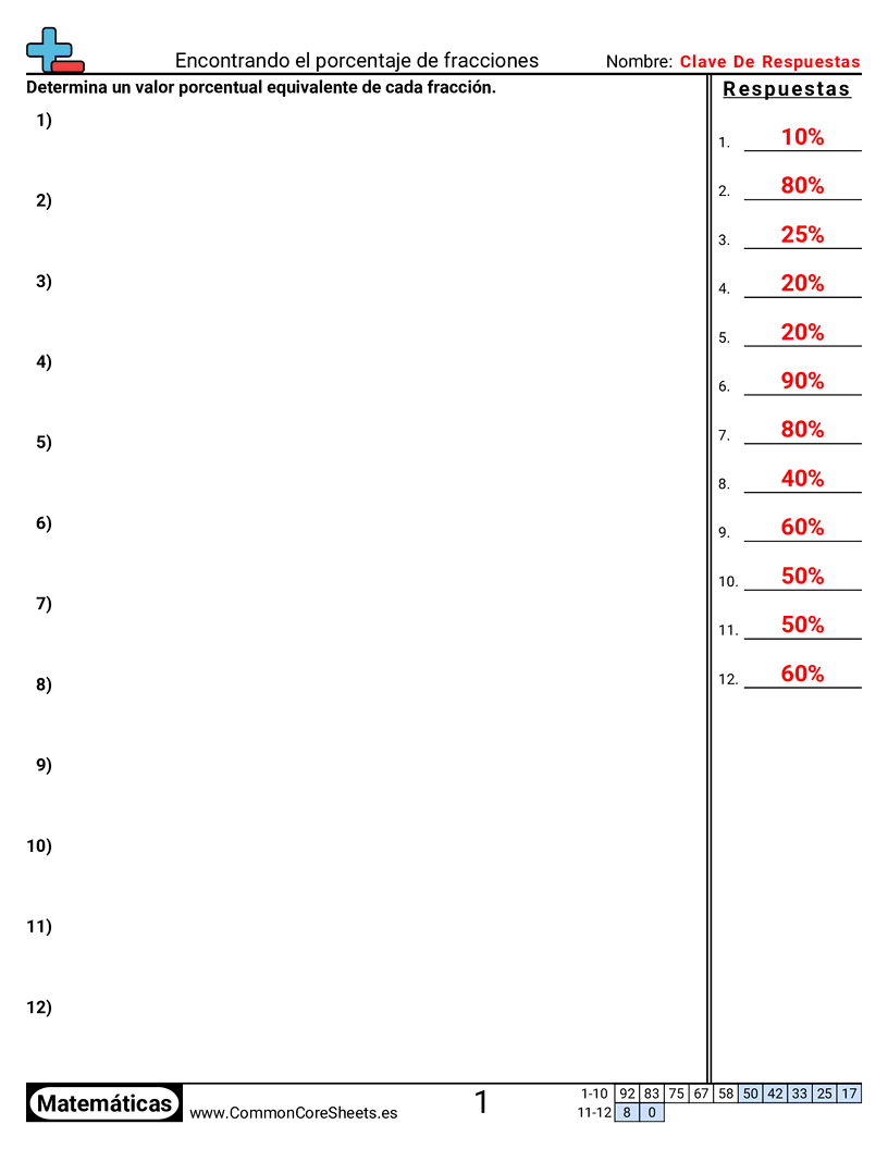 Hojas de trabajo gratis de math sobre Encontrando el porcentaje de fracciones. Cada hoja tiene 12 ejercicios con hoja de respuestas y es ideal para maestros y educación en casa. Puedes descargar el PDF, crear tarjetas de memoria o configurarlo para aprendizaje en línea.