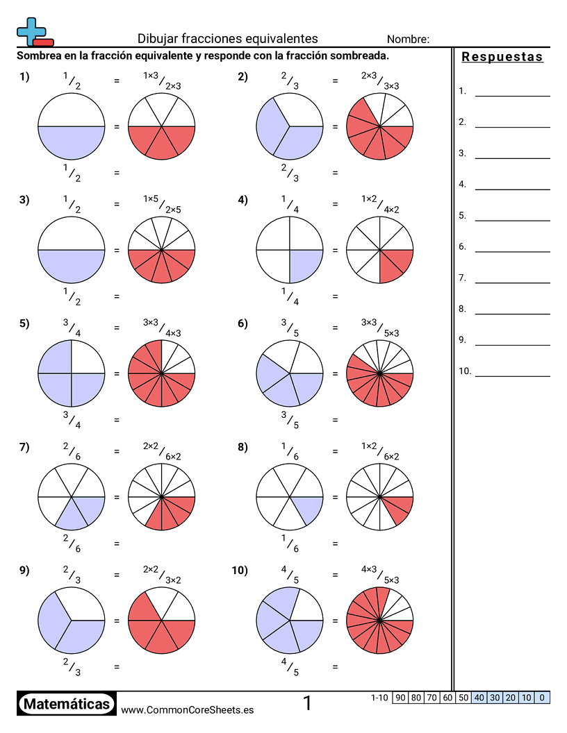Hojas de trabajo gratis de math para 4to Grado (4nf1) sobre Dibujar fracciones equivalentes . Cada hoja tiene 10 ejercicios con hoja de respuestas y es ideal para maestros y educación en casa. Puedes descargar el PDF, crear tarjetas de memoria o configurarlo para aprendizaje en línea.
